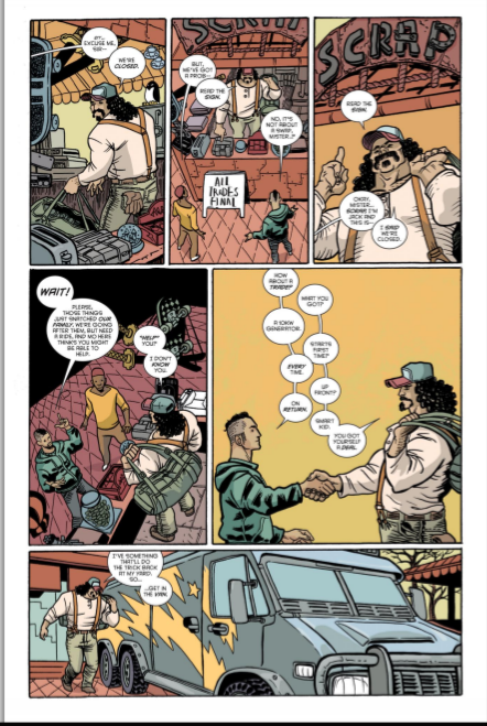 So I really like Scrap, whatever his name was before he is what he does. This big ole mountain of a man with the hair, the stache, and the ballcap yeah it’s one of those great visuals that totally meshes with the personality we get. I like this kind of synergy or collaboration we get between writer and artist. Of course Scrap is going to help the boys but not out of kindness or anything altruistic, for a trade of course can’t do something for nothing after all. I wonder how long it is before that attitude changes or if it will.