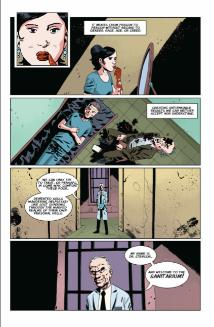 The opening with Dr. Stenson welcoming us to the Sanitarium has that classic feel like the opening of the Twilight Zone or the Crypt Keeper and it sets the mood perfectly for what we’re about to see. Also I have to say I really like that the good Doctor seems more like a fellow patient than healer here it lends more of that ominous feeling. A large part of that is thanks to Juan who nails the tone, feel and mood to get us underway.
