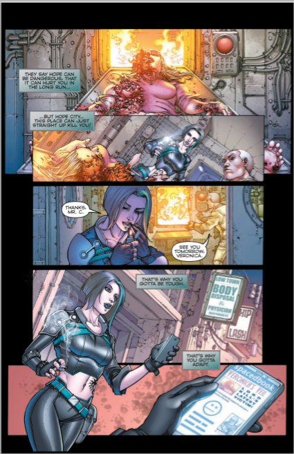 So we see two happenings here; one is a train with soldiers carrying some mysterious cargo and the one after it and we see where Veronica lives and who she hangs out with. Now the idea of using an old subway line as home isn’t new but it’s always interesting and when the train taking the route through this stop well that’s something Veronica and company have never seen since squatting there. Though I have to admit I’m more curious than ever now for some in depth background information because with electricity and tablets and such I wonder why this isn’t being used. While the story plays out we’re left with some questions and observations that they guys I’m going to say strategically give us so we come back to see if they get answered.
