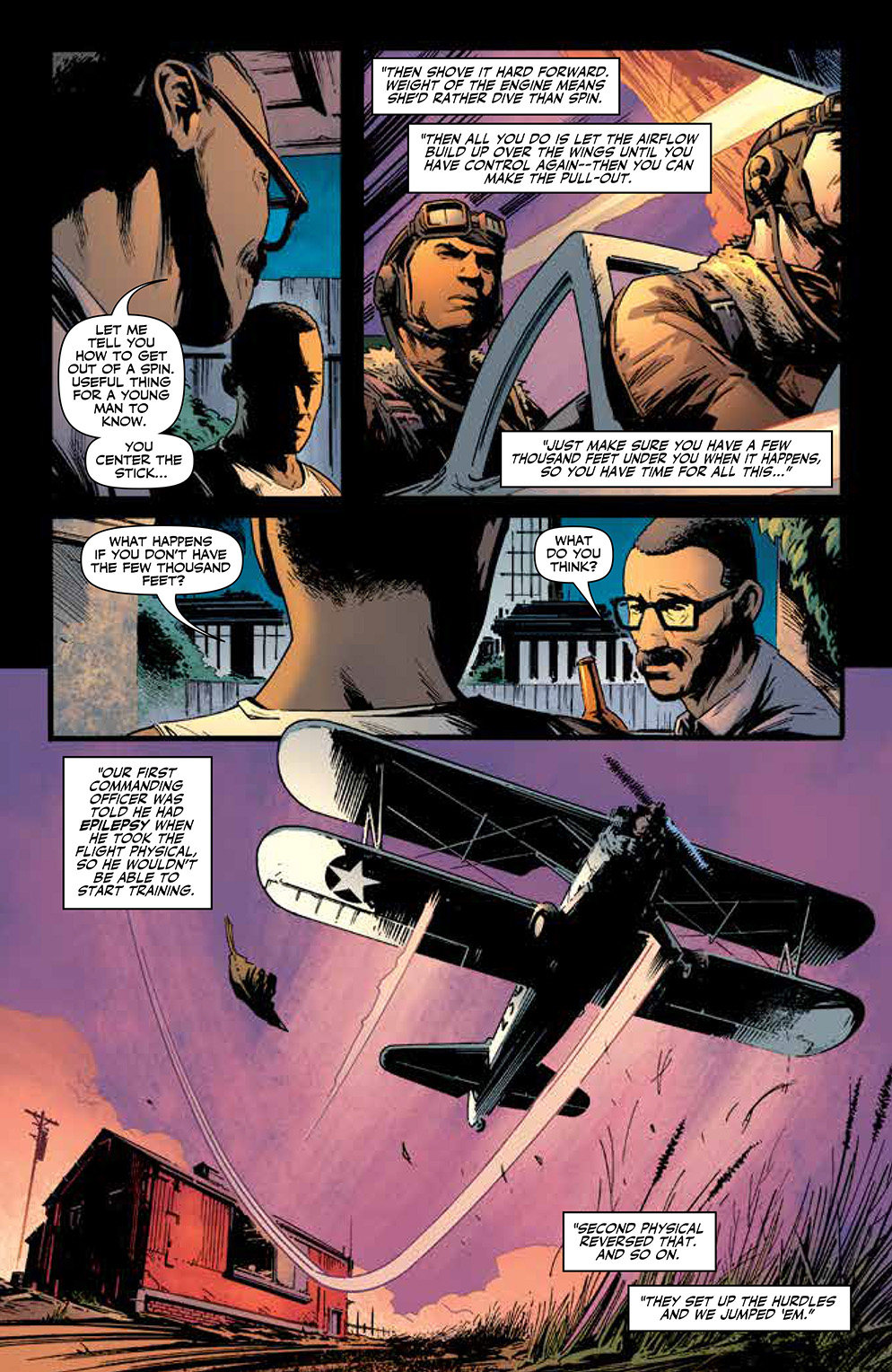 Simon and John bring something just as incredibly special to the book as well. Their interiors are stunning and the amount of detail and shading brought to the book is just wow. The sense of emotion they can get a reader to experience just from seeing the weary look on dad’s face and the growing awe and respect from his son speaks volumes to me as a reader. Also the way you see in the characters faces the eating of their anger and frustration cannot be matched anywhere else today. Then of course their are the planes themselves which yeah such authenticity is on display.