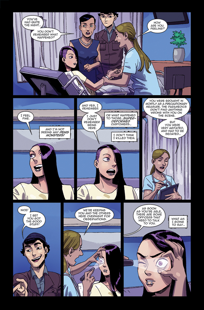We find Vampy in the hospital for the better portion of the issue getting questioned by her family about what happened. She remembers the events from last issue but intelligently decides to say she doesn’t. The news story about last issue’s events catches the attention of some characters that so far are nameless but should be of note considering one guy is hinted at knowing about the Vampblades. The girl we see doesn’t say anything.