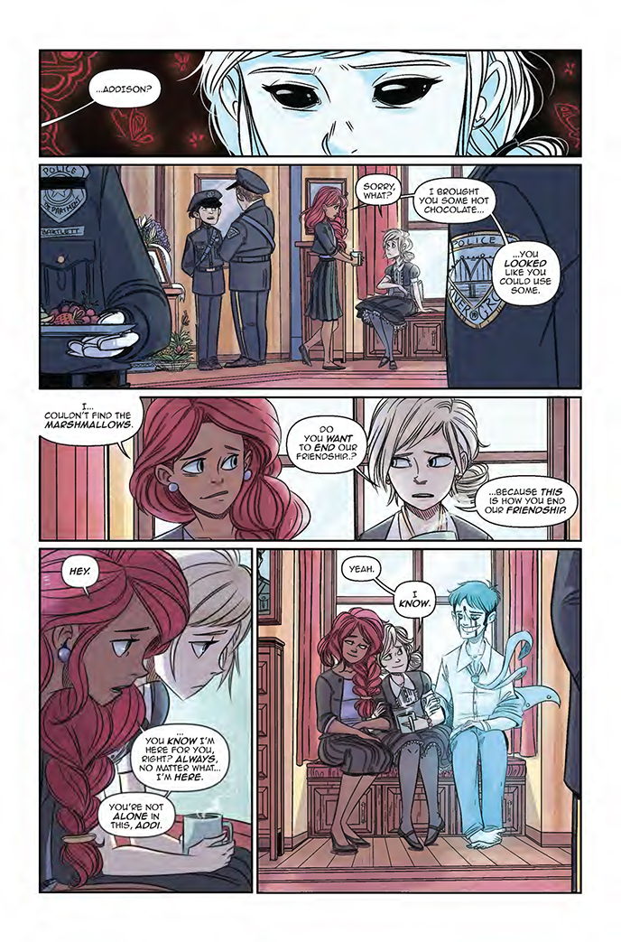 It’s also revealed this issue that Addison’s father can see and speak with one of the ghosts of the murdered while the younger one watches over Addison. I’m very interested to see where that story goes and to find out how much he really knows about his father’s and Addison’s secret world.