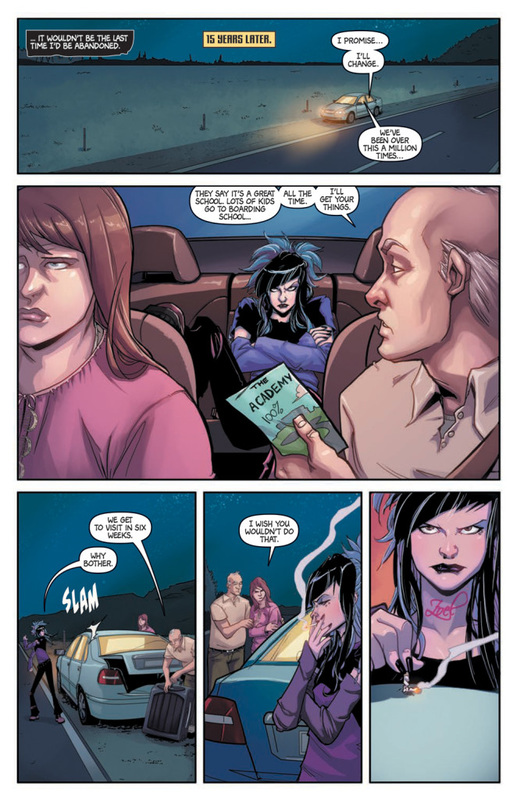 Zoel is a young lady with an attitude, she’s also the one from the dumpster. I recognize the remorse in her words in order to placate the parents she’s with, I’m guessing adopted or foster. When that doesn’t work she’s herself and she’s a complicated young woman that’s for sure. She looks like the kind who acts out before finding herself but I have a feeling that as the story progresses we’ll see she’s a bad seed. Under the guise of being sent to boarding school she finds herself with a whole “freshmen” class.
