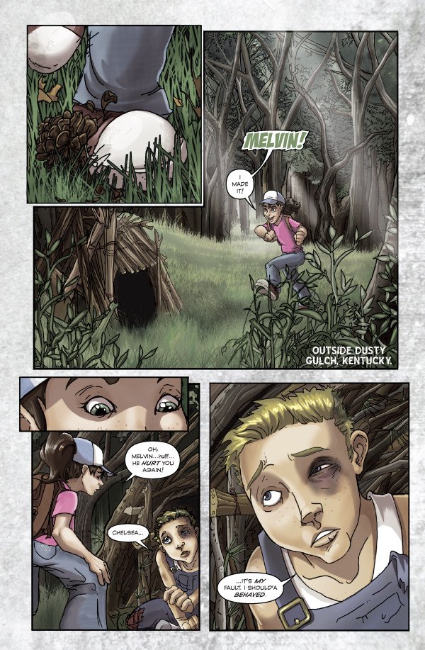 I’m not gonna lie, this book done gave me another reason to feel creeped out by freaking clowns and not wanna like ’em even more. Kevin LaPorte certainly did a good job in conveying the creepy aspects of the clowns in the writing while Amanda Rachels did a fine job in the art area in making their looks match the creepy actions they do. Nathan Leuth’s colors matched perfectly as well in my view. Sure, these clowns might have good intentions where abused kids are concerned but considering the way they go about it is some straight up horror film styled stuff and I’m liable to have a nightmare or two when I go to sleep later tonight now cause of it. This would make for a fantastic horror film adaptation and those who love killer clowns would more than likely love the Hell out of this! Course for me, I would probably avoid watching it cause I’m a pansy when it comes to horror films. And the whole madness of this all begins when two good little friends are out in the woods together.