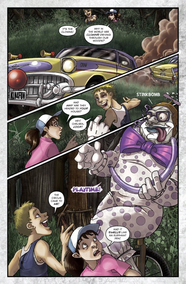 Summary: Clown Town. Where killer clowns are avenging spirits for abused children. Where abused children meld into the carnie masses, masked by twisted inner faces. Where young Chelsea Schroeder is left to her own devices in the search for her lost friend, Melvin. But Melvin may already be a part of the dark circus, simultaneously its beneficiary and its victim! And Chelsea may soon join him, unless she evades the clowns who just may be her saviors!