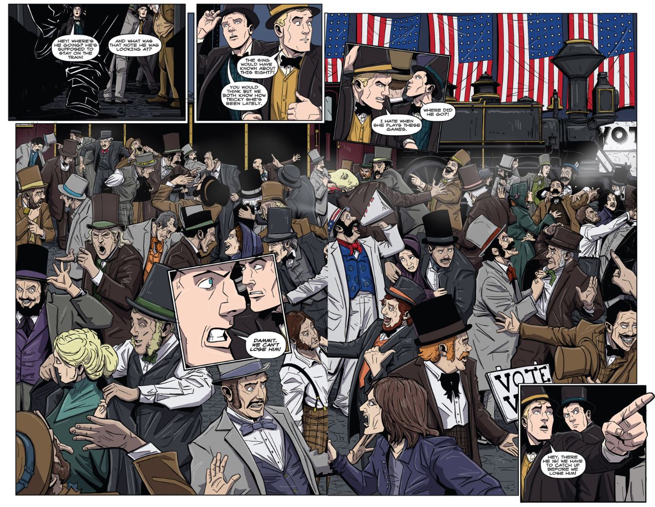 I’m bad I know it’s been way too long since I’ve visited the boys and this series. Cataloging my collection reminded me I have a few issues to review still so here we are. The boys have a very drunk and passed out Edgar Allen Poe on a train in 1849 to open this story. While the boys are keeping an eye on Poe doing what Poe loves to do most, drink apparently, it’s an opportunity for Alex to do a little more serious background characterization.