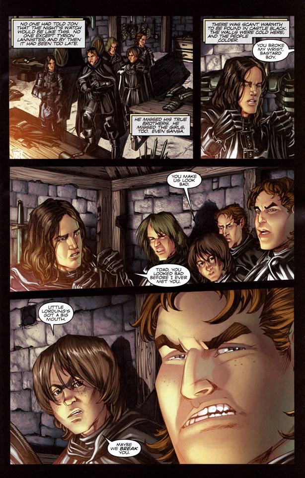 I do like looking at some of the characters because unlike the TV show where everyone is aged up as to bypass the whole preteen fiasco this comic through Patterson’s artwork really does portray many of the characters as their age. And as someone who is used to a somewhat older Catelyn Stark it’s quite interesting to gave upon one who looks like she’s supposed to be in her 30’s like in the original books. The same goes with a Jon Snow that looks like he’s actually 14, not mid-20’s like in the show.