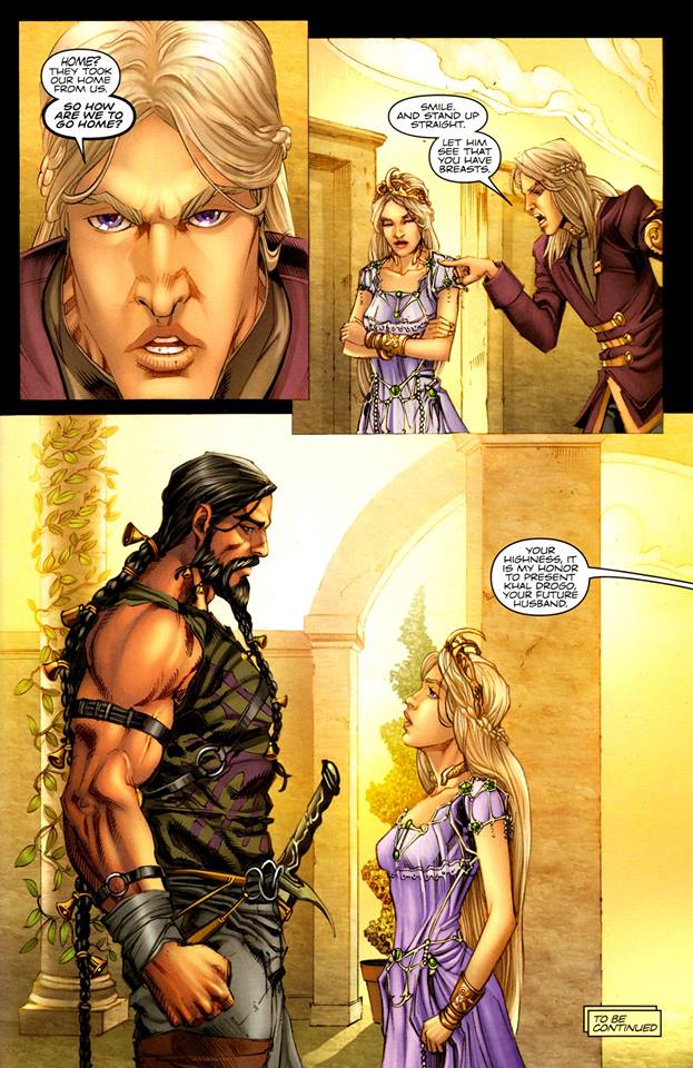 Everyone is very stiff throughout this first volume as well. Generally when some moves on a page the trick is to make the shift as fluid looking as possible. Patterson just doesn’t succeed in that department as any movement made by a character often looks like a statue moving either suddenly or ever so slightly an it can be jarring. One upside in Patterson’s art however is most of he time the characters at the very least look their age. With the exception of Daenerys, though that’s because she’s supposed to be a sexually active 13 year old. And I can fully understand not wanting to make her look actually 13.
