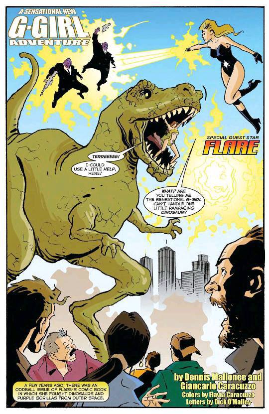 14302354_10154033879813720_217333117_nThe first story isn’t bad. I like the art quite a bit and I overall I enjoyed the story. It doesn’t have a lot of action in it except for the opening sequence with a guest spot by Flare, another hero from this Champions-universe, where her and G-Girl have teamed up to fight a T-Rex and purple alien Monkeys in suits. So pretty awesome superhero fair.