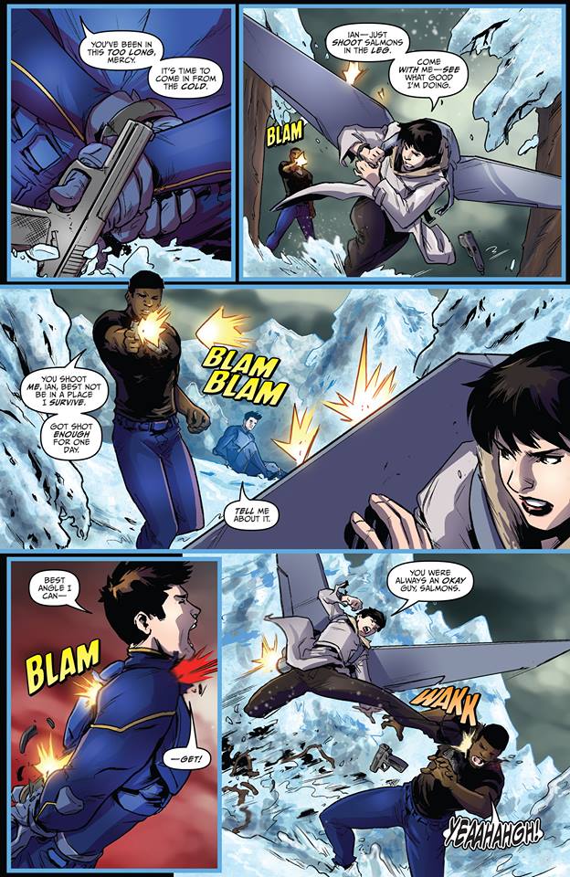 Things obviously started taking a turn for the worst when I complained that I felt the story was moving a little too fast because issue #4, in my opinion, takes a complete nosedive in quality as we spend the entire issue with Doctor X explaining to Action Man why she did what she did, her backstory in becoming Doctor X, all the while forcing Action Man to take her to a location that ultimately proves fruitless. Salmons is revealed as well and alive after being shot point blank and knocked off a cliff. And the other supporting cast members also find time to show their faces in the final pages in a contrived fashion.