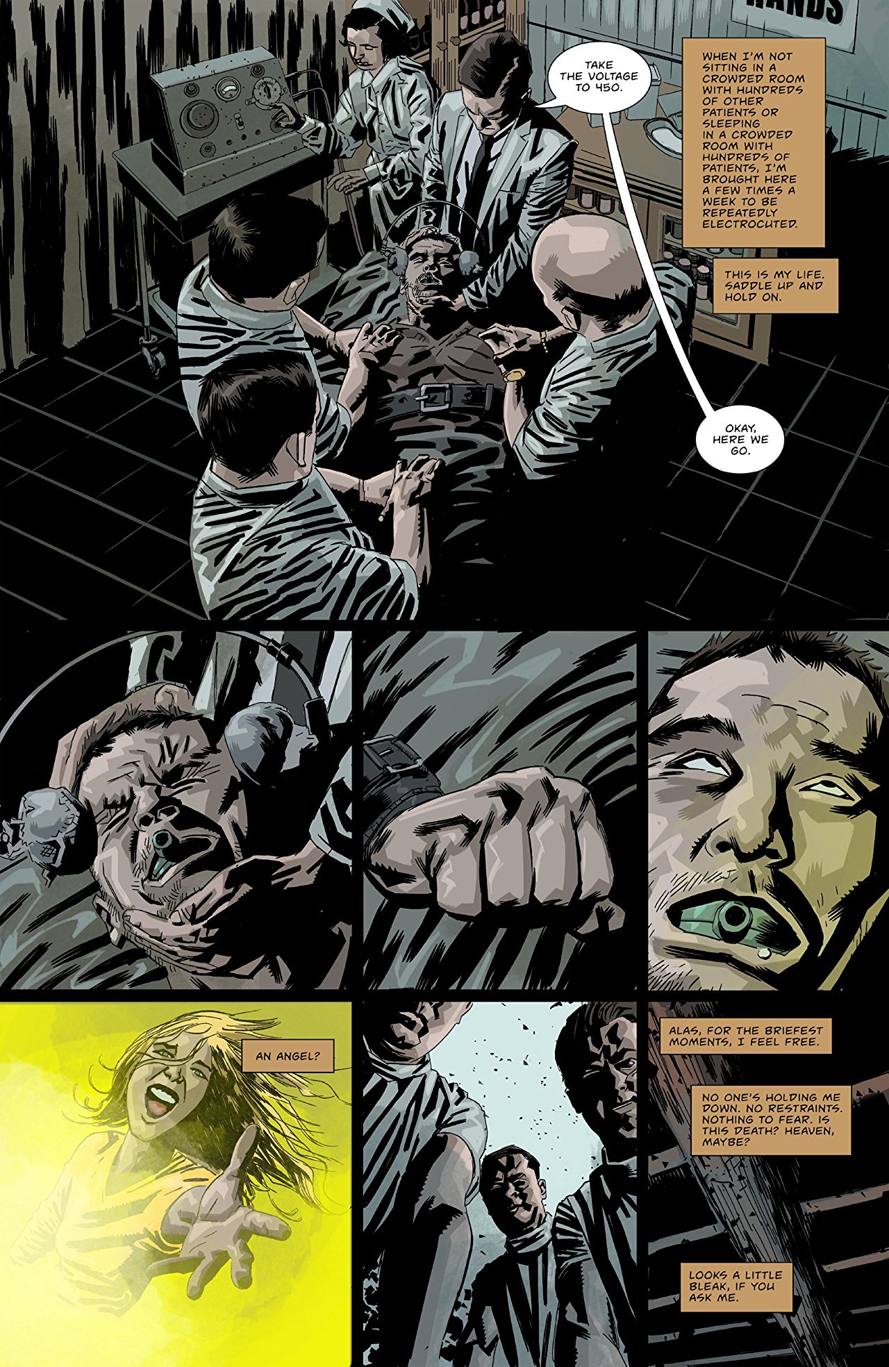 coat sent it to me, I am still very unsure of what’s real and what’s not by the end of this. Which really doesn’t happen that often for me when it comes to comic books. So nice work there for making me feel that way Kevin! Marc Olivent’s colors for the art really fit the tone of the book since Alistair is definitely in a pretty messed up situation while stuck in a mental asylum. Not to mention thinking he’s living another life in a medieval fantasy world. And you have to make sure you’re paying close attention to what’s going on or you might get lost and confused as present and past tend to switch pretty quickly without any warning. And with what the Doctors had been doing to him around the beginning of this story, it makes you feel a little uncomfortable with the thought of your own mind being screwed with like that just to provide better behavior and the like. Results that also cause amnesia unfortunately. Which is some scary crap right there! Though whether or not the amnesia is actually because of the treatments or something else that caused it truly remains to be seen.