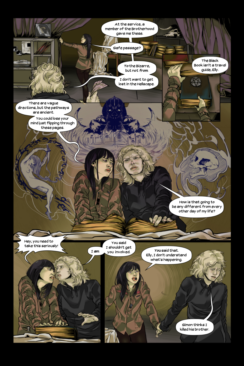 AB: The advantage of producing a webcomic versus not doing so is the same as making any other leap in life. If you want to give it a try but you don’t do it, you won’t experience either success or failure. Instead, you’ll remember that time or great swath of time in which you did a lot of hand-wringing. The disadvantage is, whether you’re on a team or working alone, you’re going to spend a lot of your free time delving into areas of expertise you’re unfamiliar with. Web design, advertising, and (starting with chapter 3) lettering are all things I’ve never dealt with and they’re only a few of the aspects of creating a webcomic that have caused me endless frustration. With any luck, I’m learning.