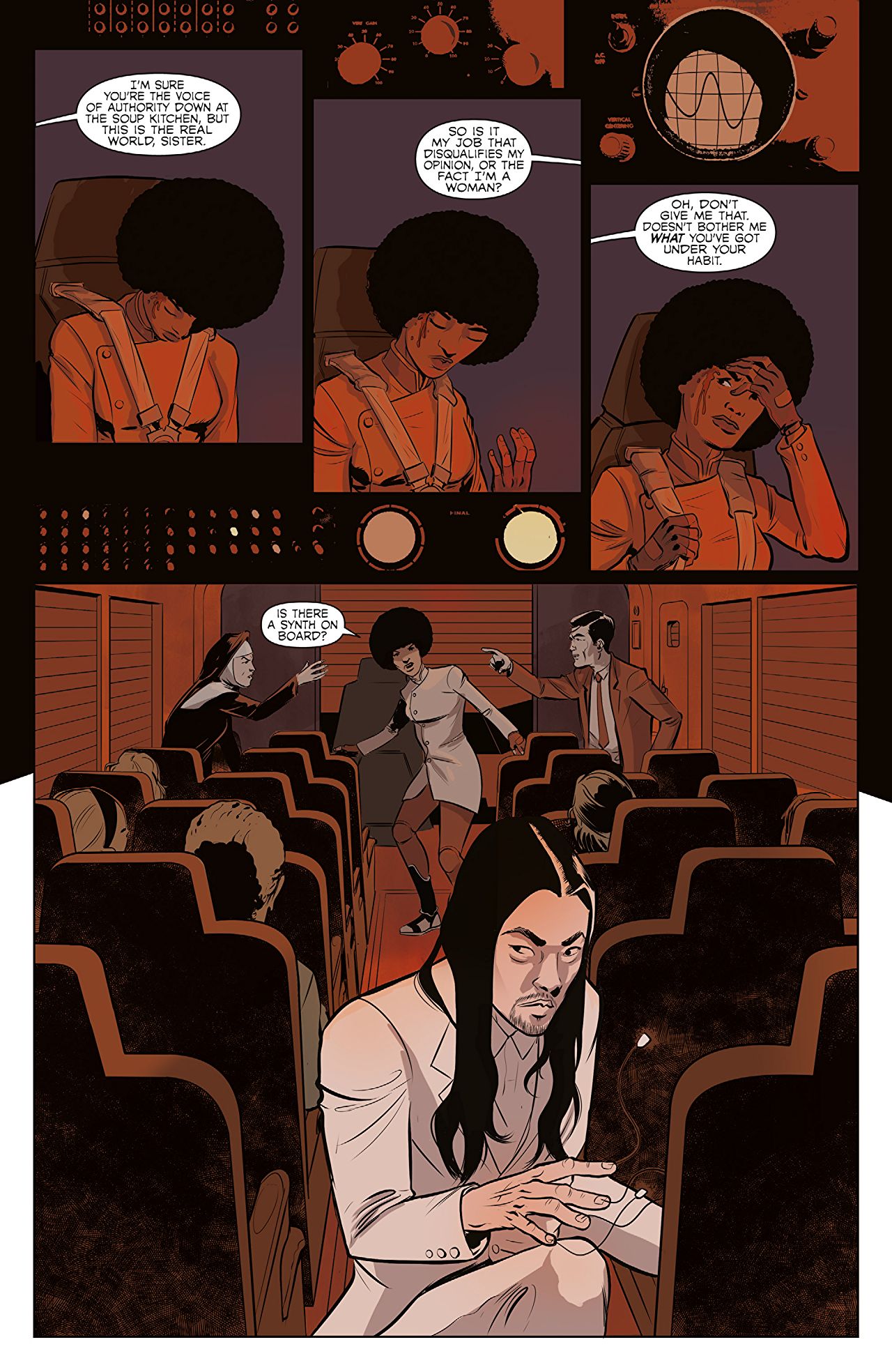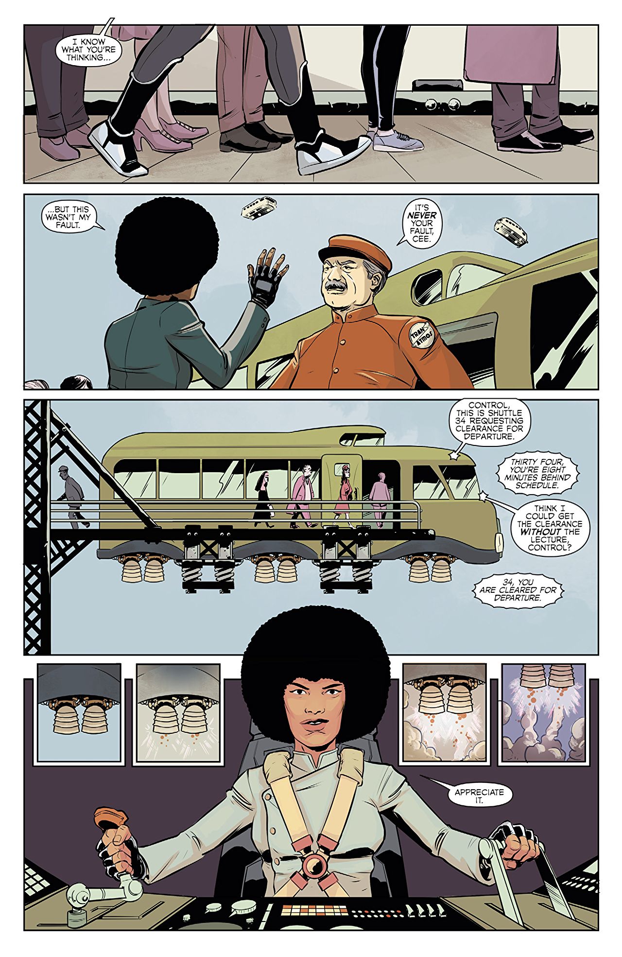 The opening here is fantastic and I love Cee, from the moment we see her sitting in her chair getting ready to drive the shuttle bus, which by the way is an actual flying shuttle style bus. Taking public transportation to a whole new level! The futuristic world they come is great and as we see as this issue goes along they’ve got a number of types of beings there. Alongside some very familiar characterisation of the people we see on board the shuttle bus.