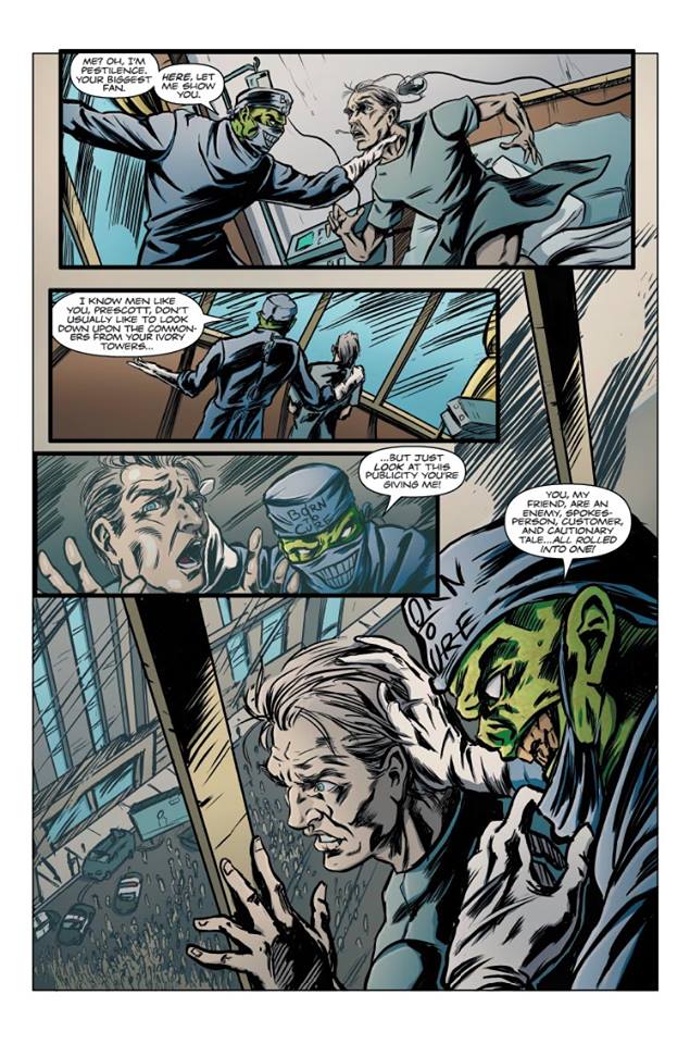 One thing is clear about ol’ Pestilence, and that’s that he doesn’t sugar coat things at all! Which is probably better to deal with from a being like him then to have one act like he or she is your friend when they really aren’t. And how he handles Prescott in here is a lot better then how Famine handled that poor woman. Even if it was rather public in how Pestilence handled him. Not to mention how he basically gives the crowd and those watching a few things he probably considers as home truths. How folks will handle that in the aftermath is anyone’s guess aside from Frank himself! I love the depths of Humanity that Frank explores in Modern Testament. Showing that for every bit of Sunshine out there, there’s always the darkness lurking about, just waiting to come out at the right moment and drag an unsuspecting individual into its hands. And whatever happens next in the series, is something I am seriously looking forward to seeing. So don’t sit on the fence with this series, as you just might regret it if you’re the type who likes seeing the darker depths of humanity be explored!