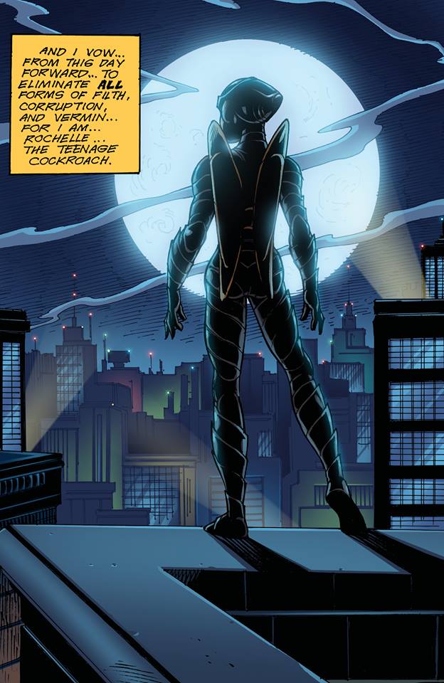 Review: Rochelle is a book I’d been eying for quite some time. I really liked the design of the character on the covers, and the concept of a teenage cockroach out there fighting crime sounded like too fun a thing to pass up on. As soon as the first three issues were added to ComiXology then I snapped’em right up and devoured them. Who knew cockroach could taste so good?