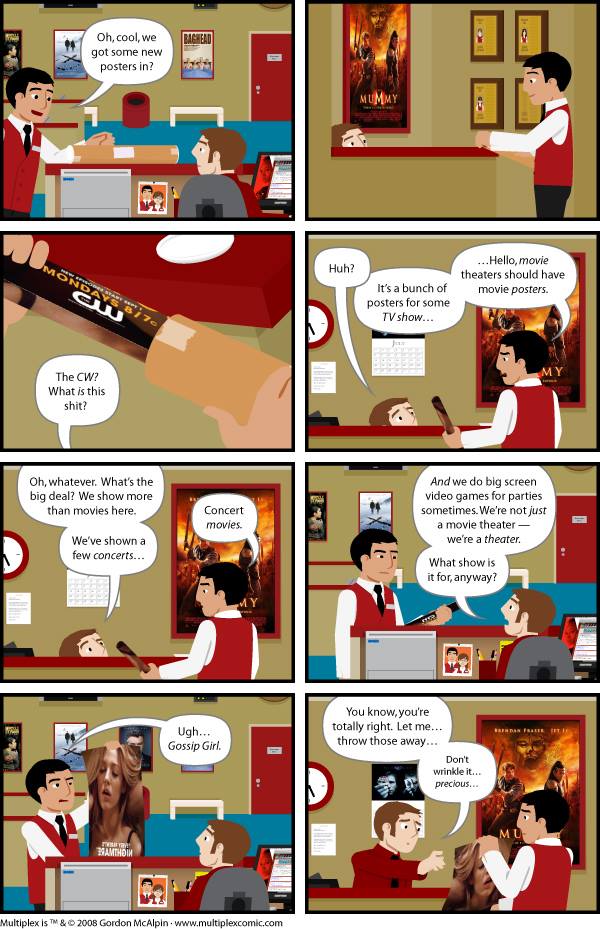 The series never forgets about the movies however, and whether it be in the main comics or the extras that are added for this collection the evolving landscape of film is ever present in Multiplex. It’s fun seeing how the different characters react to film news and the actual releases themselves. Some films even inform whole arcs like the interesting dynamics between Jason and Angie that culminates in the release of Religulous in 2008. What happens? That’s for you to find out, dear readers (more information on that below).