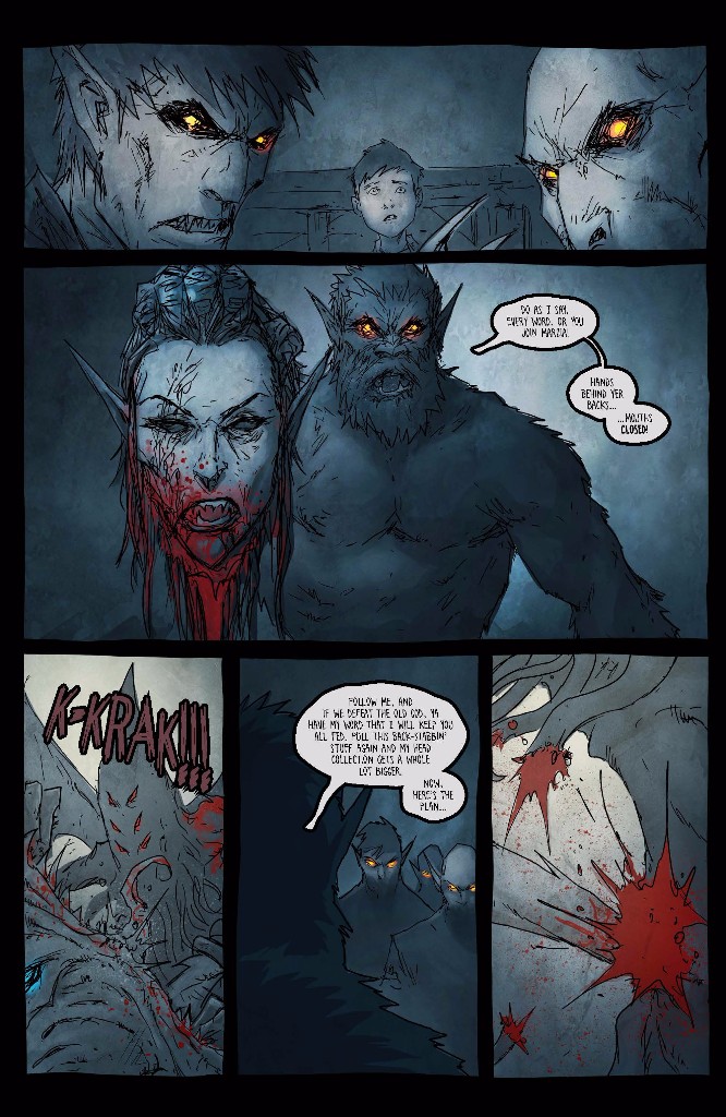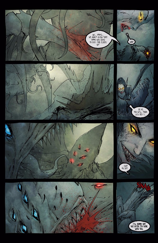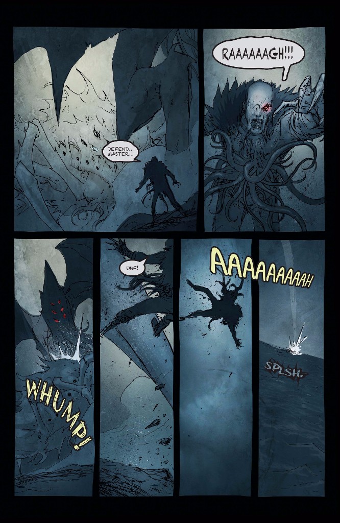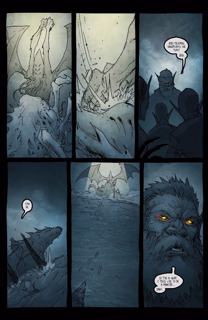 They’ve faced cannibalistic bikers, gill men, Tok-tok, depth dwellers, vampires, krakens, and Cthulhu himself. Now, the heroes of BROKEN MOON: LEGENDS OF THE DEEP must be witness to a battle deciding the fate of the world. Dagon has been awakened to fight Cthulhu, and it’s not guaranteed that anyone will survive the encounter — in fact, readers not yet caught up on the series who are keen on avoiding SPOILERS might want to skip the following pages!