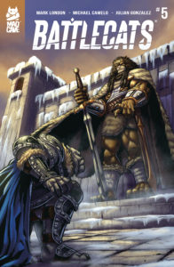 So much curiousity and wonderings and so few answers! Kudos to Mark London for causing that to happen in a reader like myself and I can’t wait to see what he has in store next for readers like you and me. The transition from Andy King to Michael Camelo on art duties is (to me at least) flawlessly done and were it not for looking at the credits, I woulda thought I was continuing to see Andy’s art in the pages of issue 5 and Julian Gonzalez adding some beautiful colors to it. Heck, the first of the Darkats we see in this issue shows a menacing but awesomely bad ass cat! One I definitely would not want to come across in a dimly lit alley! Secrets, attacks, arrests, and looming wars all abound the more this series goes on and I am getting all kinds of excited over it! Who is truly in the right (Battlecats crew for sure!) and who isn’t? Will our Battlecrew end up going their own way after the events of this issue thanks to the King’s decision regarding them? Or will they fight on the right side, who or whatever that may be? Only time will tell and hopefully that time won’t take a long while!