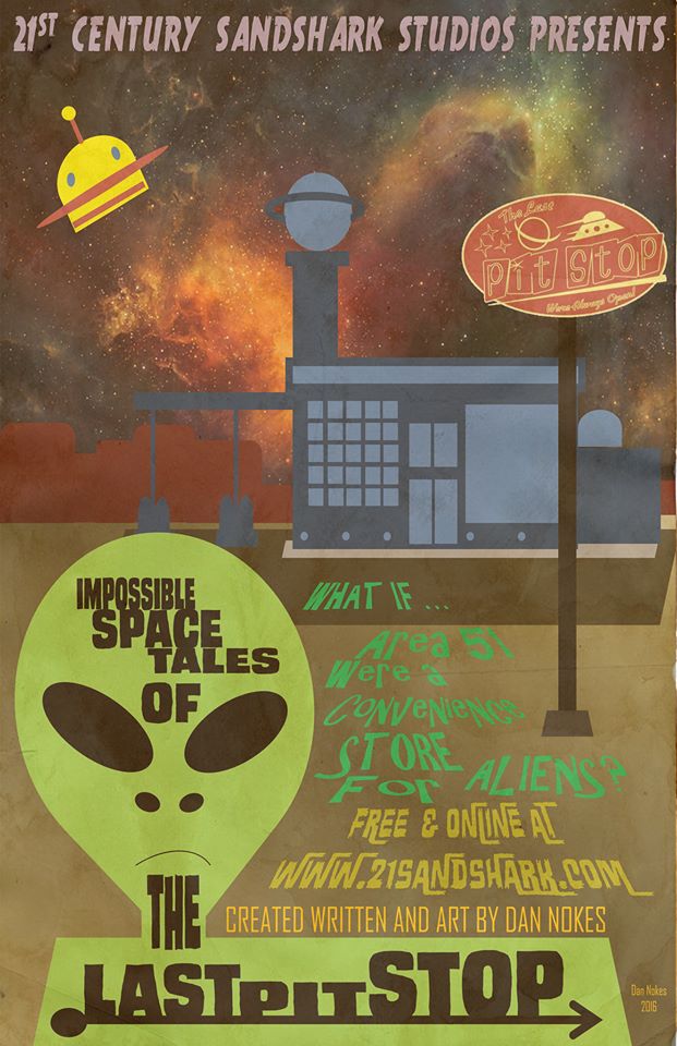Well at the moment I am about of the third of the way done on the final issue of IMPOSSIBLE SPACE TALES OF THE LAST PIT STOP. The story is mainly: WHAT IF AREA 51 WERE IN FACT… A CONVENIENCE STORE FOR ALIENS. The previous 11 issues are online and free to read. I am looking forward to wrapping the series up and launching a Kickstarter for a TPB by end of year.