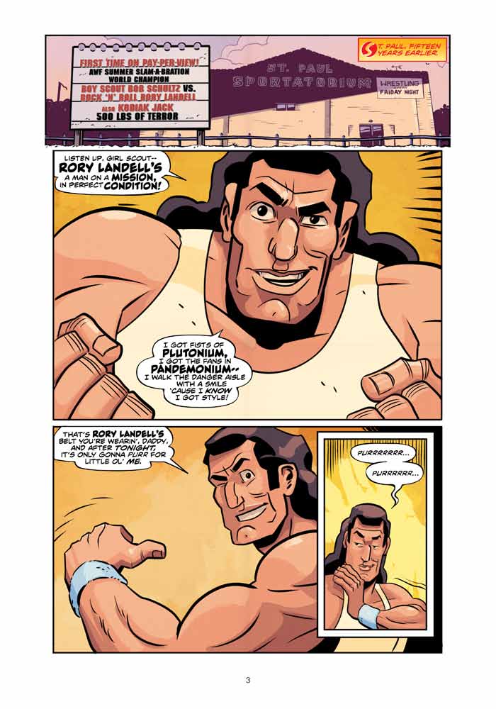 I love Wrestling, especially good wrestling. And if its got some kookiness to it at times, even better. And Ed Kuehnel and Matt Entin certainly capture that quite well while nicely managing to keep things serious as well in this comic of theirs that’s the latest to add its own touch to the Wrestling Comics genre. Rory Landell, the Rock and Rollin’ guy of the Universe, is this fair story’s main star! Albeit, he’s a bit driven and seems to have something of an ego that is clearly getting in the way. Of course, I’d be feeling a little unhappy too if my dreams were about to be achieved of winning the belt, only to see that taken away for whatever reason. Whether something like this is something that the creative team themselves have experienced or simply heard through stories from others, that feeling of disappointment is easily felt. Along with making bad choices while feeling angry. Of course I’m darned curious as to how those bad choices are gonna effect Rory where the Cosmos are concerned.