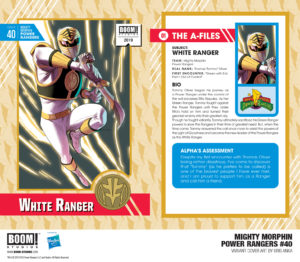 Now fans can collect each of the Mighty Morphin Power Rangers in a new set of Trading Card Variant covers, illustrated by Kris Anka and designed by Dylan Todd. The MIGHTY MORPHIN POWER RANGERS #40 cover by Anka features the brave leader of the Mighty Morphin Power Rangers, Tommy Oliver, with an image of the White Ranger in action on the front, and all his stats on the back cover, including his team name, alias, biography, and details of the Mighty Morphin Power Rangers’ first encounter with Tommy as the Green Ranger.
