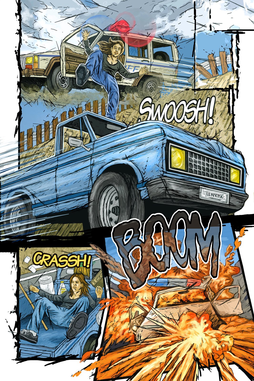 Finally Marla gets a big action scene of her own at the end of the issue when she commandeers Sheriff Bonk’s jeep in order to chase down a guy who’s tried to help her in the past with finding her sister. It’s a pretty neat chase sequence although there is one panel where she’s driving through some bushes but a lack of speed lines makes it look like she’s parked in the bushes instead and I completely got taken out of the story for a second.