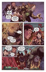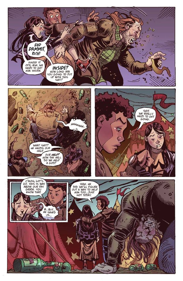 Barnhardt keeps the narrative focused on the characters, hinting at how the world became a tragic dystopia without ever fully showing it. The one fight we really see are the flashbacks to the heroes’ first encounter with Balam the demon and his subsequent massacre of what appears to be this world’s top superteam. We never see Balam actually wreak havoc across the globe but we don’t need to as it’s felt in the modern day scenes where Legend and his family, the McCoys, are broken and trying to make a living at a carnival.