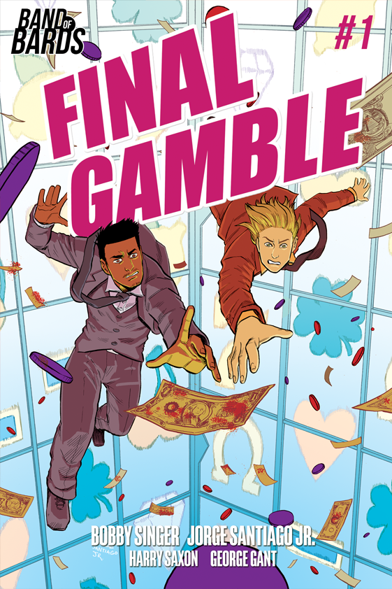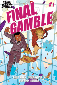 Aug. 4, 2021, (TAOS, NM) — Band of Bards is proud to announce its debut release, Final Gamble, a dark social commentary about the grip of predatory society, created and written by Bobby Singer (Flame Angel, Paul) with art by Jorge Santiago Jr. (Spencer and Locke), colors by Harry Saxon (The Miracles, Vagrant Queen), and letters by George Gant (Beware of Toddler). Just think, if you play your cards right, you might get to walk away free.