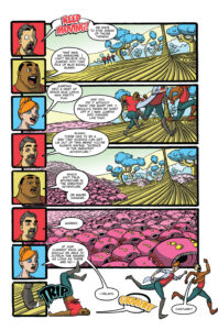 As fate would have it, I managed to come across Rick Flash & The Adventurenauts on Twitter without meaning too. But you know what? I’m glad it happened because this book was an incredibly fun and even goofy read from start to finish. RFTA is essentially an inspired 1950s style Science Fiction (and sitcom) era inspired book and even with my limited viewing of that era, the book captures it really well. Marshall Litchfield, Scott and Mark Pate all clearly had fun writing this story as we see Rick and his team deal with giant hands, ship eating bugs, quests for needed parts, and giant evil robots who may just really need a hug at the end of the day. Oh, and can’t forget all the stories Wrench tells about his ex! Those are certainly fun! Though we mostly see him tell these stories to Jerry through out the book, who’s actually an Alien Brain who can look Humanoid! His responses to Wrench’s stories are amusing and doesn’t feel like he’s being sarcastic at all but I could be wrong.