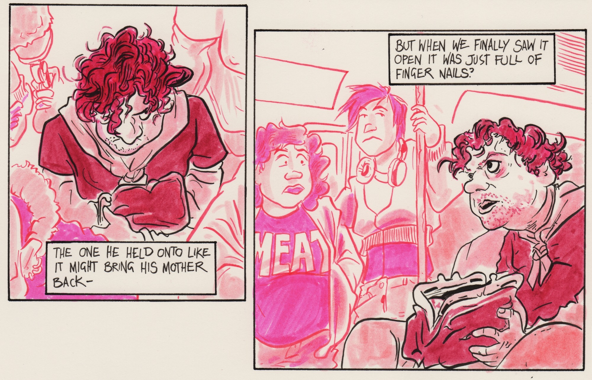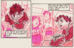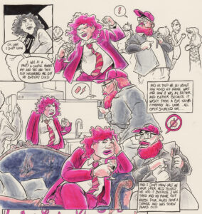 Richard Fairgray is nearly blind, with 3% vision remaining in one eye. Sick of digital coloring on his myriad other titles, for this series he jots squiggly lines to traditional pencil-to-paper and colors with markers. Once a 6-page sequence is drafted, the script is printed and layout is loosely sketched, drawn right away while it’s still fresh—that’s mad dedication to the creative process in the name of comics.