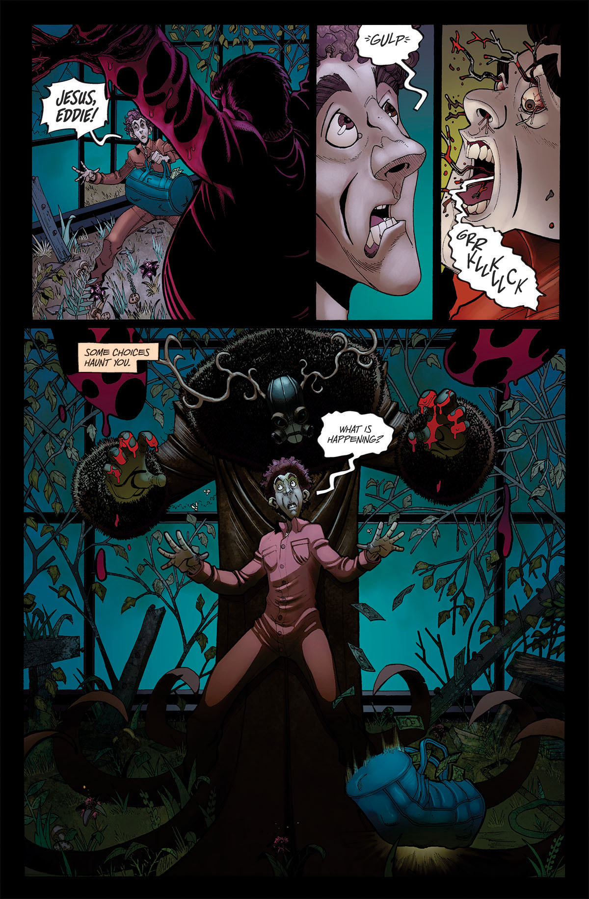 If there’s anything Life and Comics (especially ComixTribe’s Sink) has taught me over the years is that I shouldn’t take things at first sight. That I should take extra notice of things and people and that lesson certainly applies here in the first issue of Happy Hill. Even if you have known someone for years as there can still always be layers to them you aren’t even aware of and something tells me Mackenzie’s mother is gonna get a hard lesson in that by the time this story is over with. A story that is part Supernatural Thriller and Horror while also asking the question of how far are you willing to go for the pursuit of happiness? Something I hadn’t necessarily thought about until now but I’m pretty sure I wouldn’t go too far in a bad way but then again, who knows for certain. Now I’m curious about the spelling of the boogeyman for this story, is the Wudsman the original way of spelling the Woodsman or is this just something Joe Mulvey and Rich Douek came up with? I went and Googled but so far I’ve turned up nothing but I’ll keep looking either way since I am pretty curious.