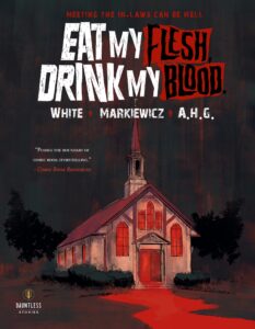 Summary: EAT MY FLESH, DRINK MY BLOOD, created by Frankee White (Broken Bear, Starless Daydream), Adam Markiewicz (The Great Divide, Broken Bear, and Into The N-Zone) and A.H.G. (Boom Studios’ Dark Blood, Broken Bear, Starless Daydream) is an absurd romantic horror encompassed in a 52 page magazine-sized graphic novel.