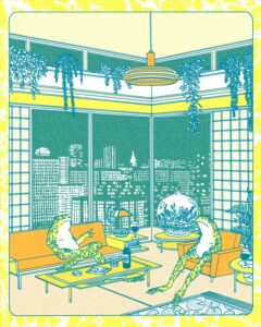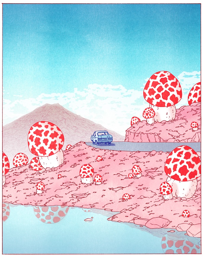 Cobb’s comics reflect the relative loneliness of contemporary life with gleaming, monolithic architecture. Metaphysical love blossoms in the dank humidity of the jungle in a whirlwind of melan- choly and mundanity. His clean, unmistakable lines razor the page through rich colour, transporting the reader to a clinical oasis, a gleaming utopia laced with irony and sweat.