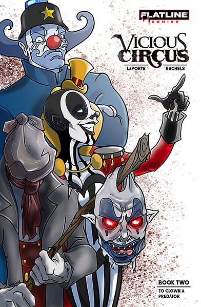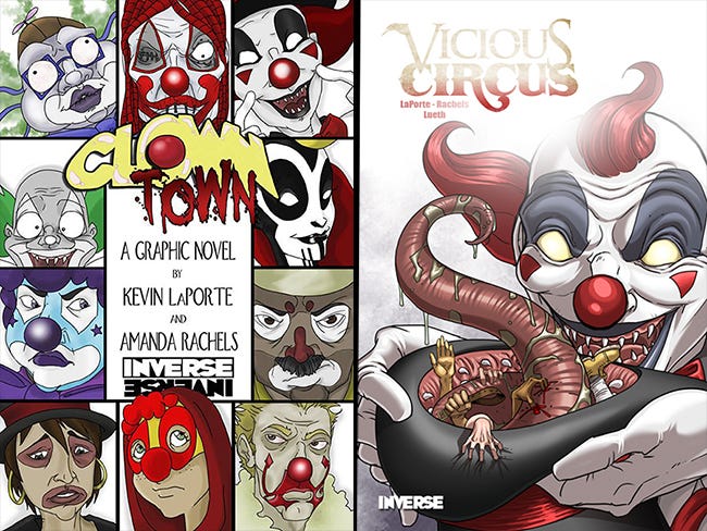 We completed the first four issues of Clown Town, the title that would become Vicious Circus, in 2011, on the heels of its primitive formation as part of a little internet comics competition called Small Press Idol. Amanda Rachels and I developed the idea at a Starbucks in Foley, Alabama, on a Sunday afternoon in January, when she sketched out the original image of the clown who would soon morph into our beloved demonic clown, Stilts: