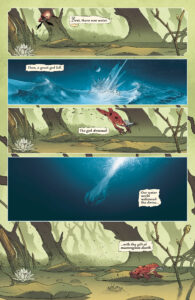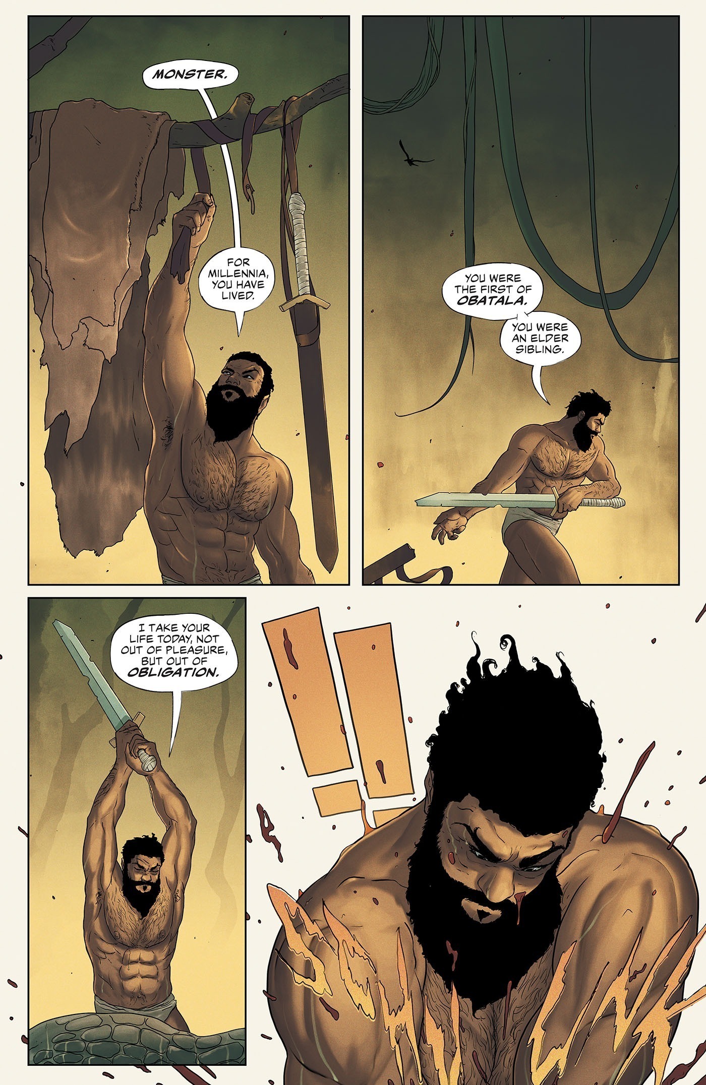But first, our boy’s gotta do some training to prepare himself for the fight and those scenes are done fantastically well by Dotun and Dee Cunniffe’s colors do it all justice as well. Now trying to domesticate those sorts of creatures would probably be pretty difficult though! But I bet Akogun could do it and probably did at some point before those he’s after so rudely came and changed things for the worse for him. I’m very curious to see how past events are going to play out in Akogun’s time, especially as some of it helped shape him as it is thanks in part to Obatala. And I’m curious as to how Ogun’s going to handle that if and whenever he learns of the entirety of it all.