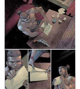 Southbound is a Cyberpunk story (and successful Kickstarter) set in Texas and centers on one Deotoro Vasquez, a Hitman seeking Redemption in order to re-unite with his family. And as mentioned earlier, Southbound is the latest from Jarred’s mind to come to fruition in this world of ours and is a five issue series. Deotoro, or Deo for short, has a couple of problems. Chiefly among them being cut off from his family for unknown reasons and has to work for despicable people in the hopes of being with his family again one day. Of course he’s going to have another problem by the end of this first issue but we’ll get back to that in a moment. When we first meet the big lug, he’s writing a letter to his kid and judging from the looks of things, its not the first one either.