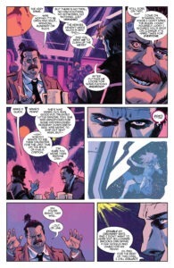I’m thankful that Damian introduced me to Patricio and Hassan. The vast majority of what makes this series so special is the talented team of the artists behind it. Damian packs each panel with incredible detail, creating this immersive, lived-in world. Patricio has an amazing eye for color, perfectly combining the gritty noir elements with vibrant, complementary colors that make each page pop. And Hassan’s lettering is phenomenal. He has this raw, unique style that ties everything together. The cohesiveness of their work is undeniable, and it elevates the story in ways I couldn’t have imagined.