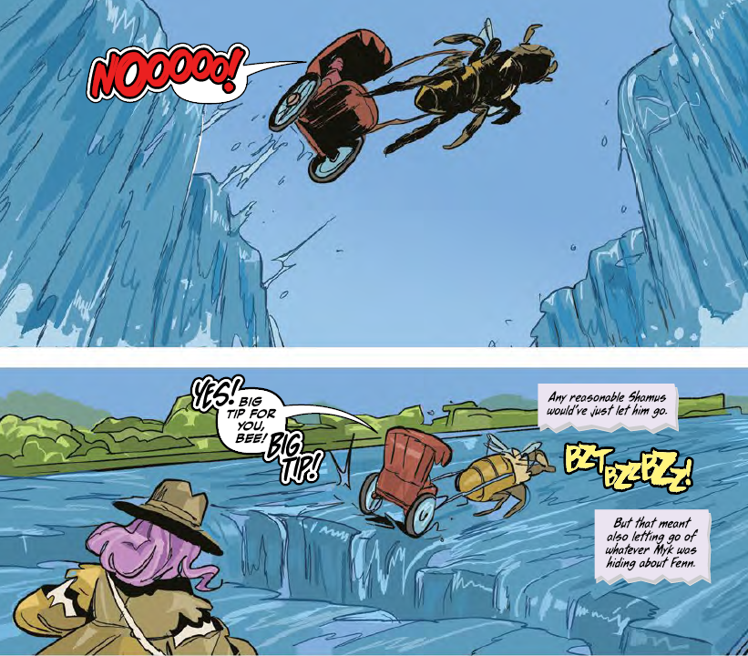 I love that in further establishing the identity of this universe that Richard Ashley Hamilton and his team have brought to life, word play is used pretty well to help show how much is different in this Post-Apocalyptic world. Such as Bingo calling her abode ‘adobe’ instead for example and somewhat reminds me of that Disney 2000s era film ‘Zenon: Girl Of The 21st Century’ due to how some phrases were changed up. Los Angeles or LA being referred to as Ellay is another thing I liked. And in true Detective Noir cliché, things for our gal Bingo begin with a dame as mentioned earlier by the name of Fenn. Who seems to want to be more than friends with Bingo. Though how same sex relationships in this world of Richard’s is treated isn’t exactly touched on but considering Bingo wasn’t outright disgusted and just shocked instead, its possibly safe to assume that its potentially accepted with no real problem.